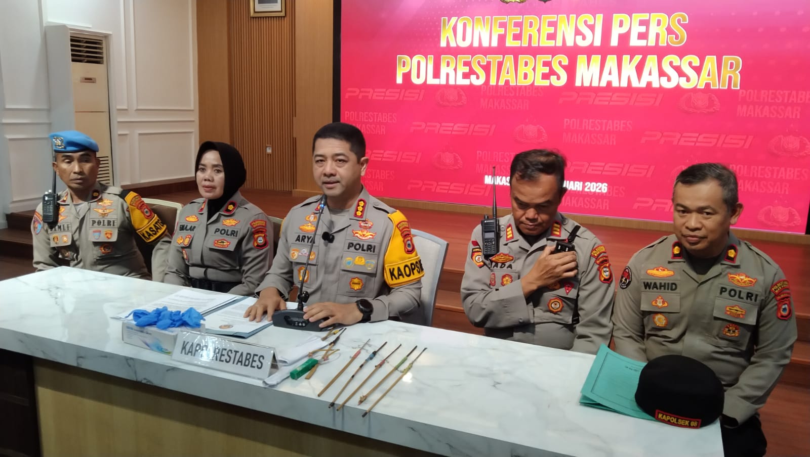 “Satu orang meninggal dunia akibat terkena busur (panah) di bagian dada yang menembus jantung,” jelas Arya saat merilis kasus di Aula Mapolrestabes Makassar, Kamis (5/2/2026).